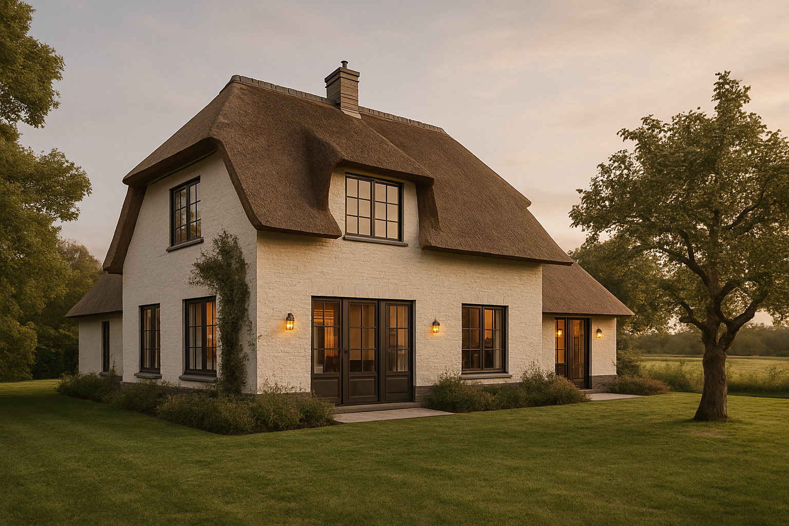 De gevel in kalkzandsteen en de subtiele landelijke details zorgen voor een warme, tijdloze uitstraling.